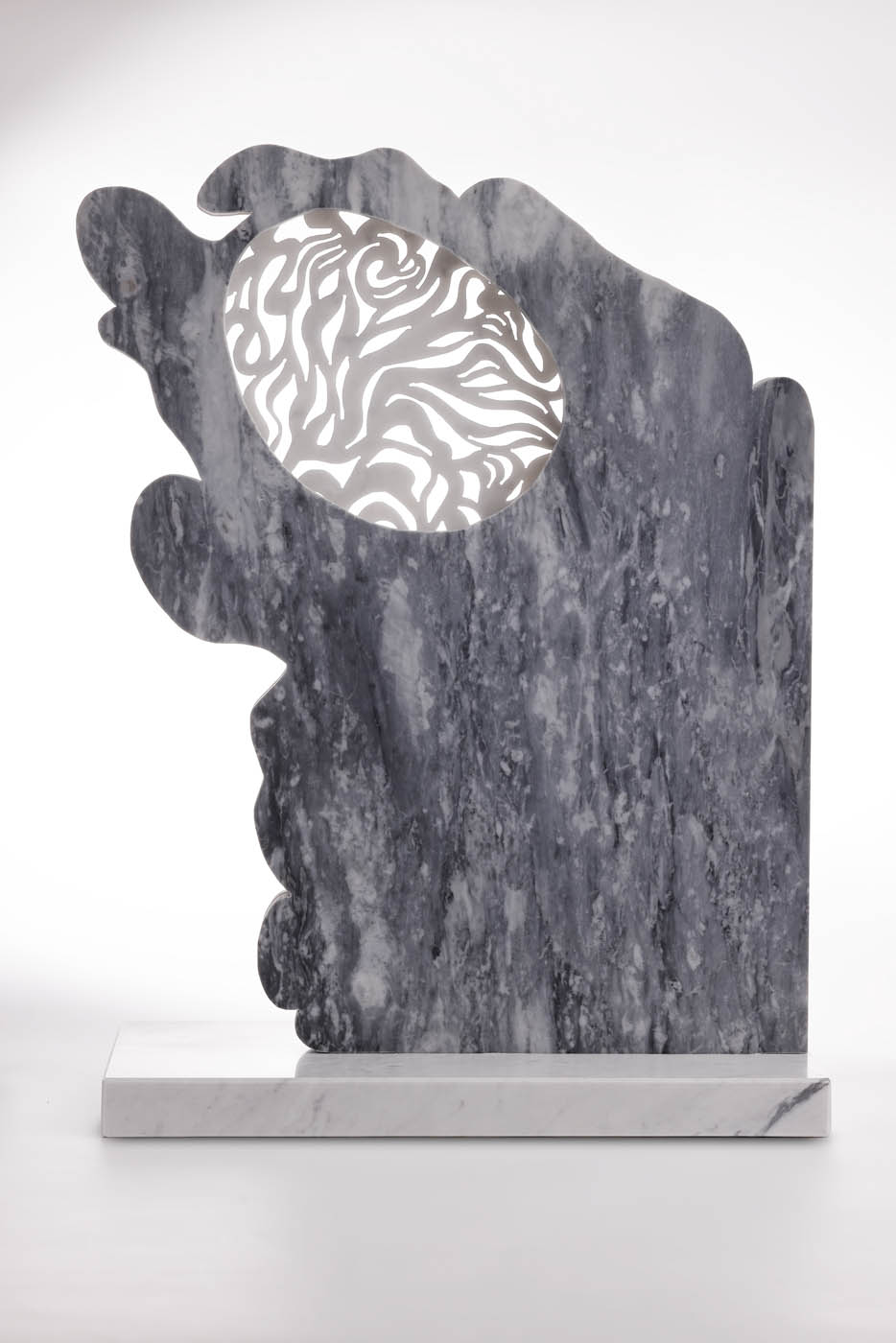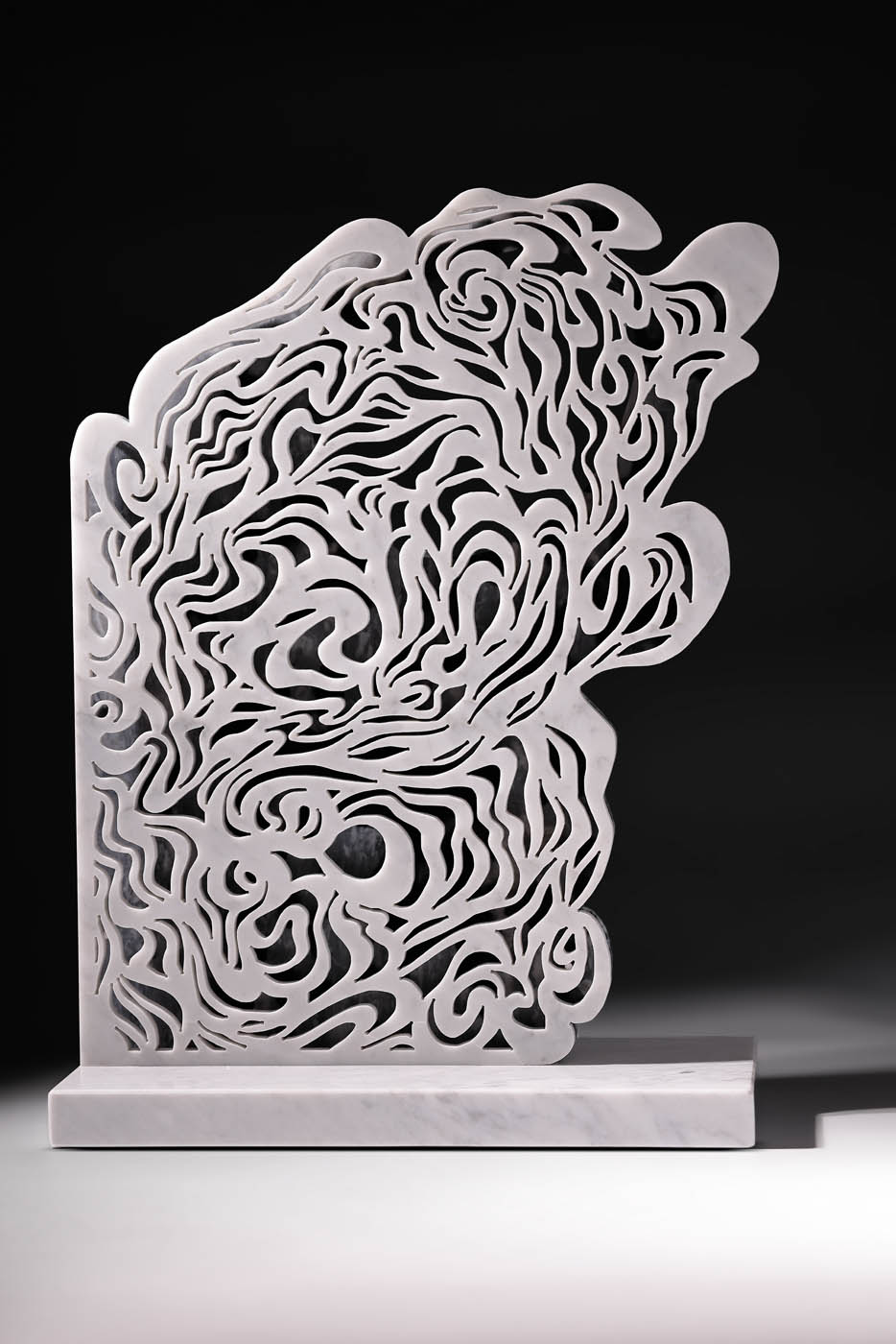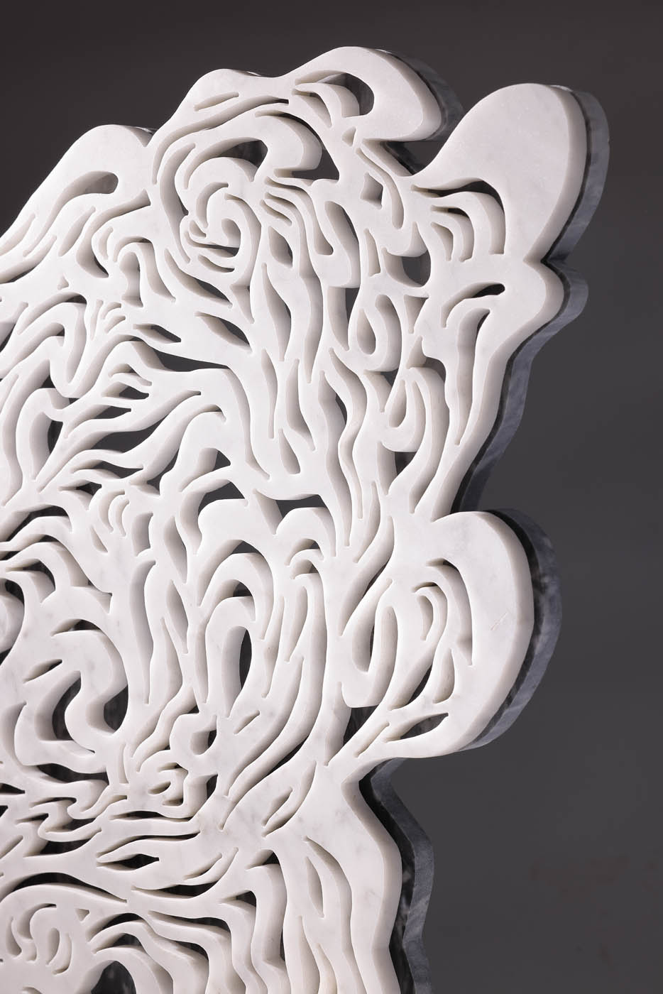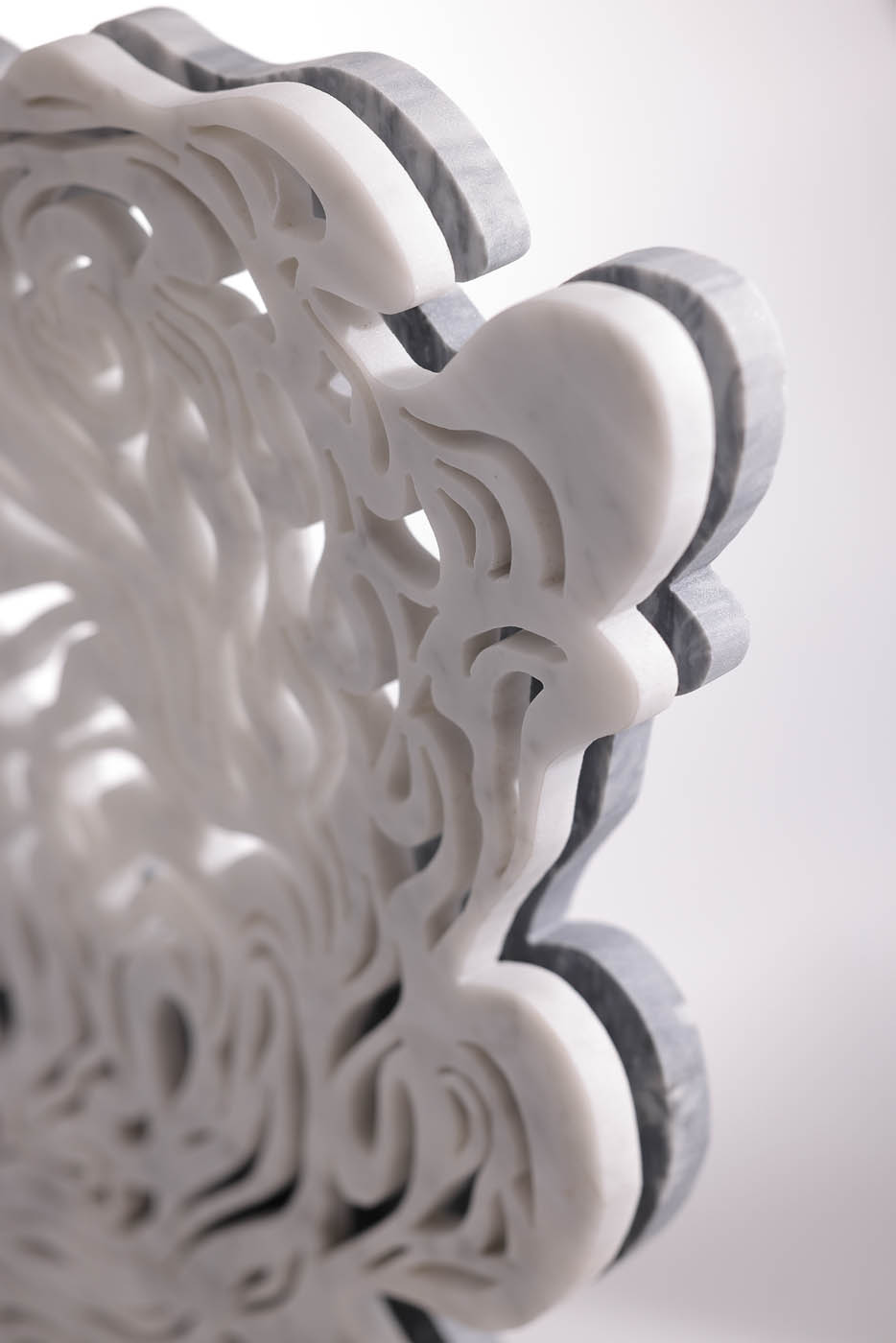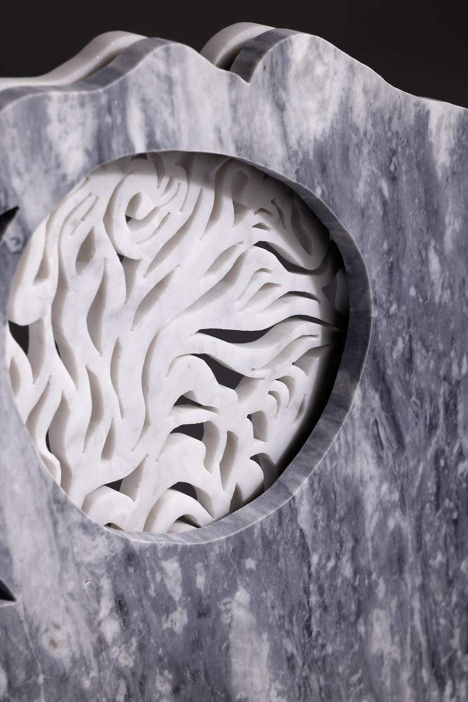“Water” è una scultura che plasma l’essenza mutevole dell’acqua in due strati di marmo intagliato. Il primo strato evoca la calma specchiante di un lago; il secondo si anima in linee sinuose, catturando l’energia vitale e il flusso incessante dell’elemento liquido.